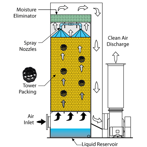 ระบบบำบัดอากาศ หลักการทำงานของสครับเบอร์อากาศเสียจะถูกดูดเข้ารับเบอร์ แล้วผ่านชั้นตัวกลางแพ็คกิ้งมีเดีย (Packing Media) ซึ่งแพ็คกิ้งมีเดียนี้ จะทำหน้าที่เพิ่มพื้นผิวสัมผัสระหว่างอากาศเสียกับน้ำ ด้วยการฉีดพ่นละอองน้ำเพื่อดักจับฝุ่นละอองหรือสารปนเปื้อนที่มากับอากาศ ซึ่งอนุภาคต่างๆ นี้ จะถูกดักจับด้วยน้ำ ทำให้ไม่สามารถหลุดออกไปสู่ภายนอกได้ ส่วนอากาศที่ผ่านการบำบัดภายในอุปกรณ์สครับเบอร์ไปแล้ว จะถูกพัดลมไฟเบอร์กลาส (FRP Blower) ดูดเพื่อปล่อยอากาศที่ดีออกทางปล่องอากาศ (FRP Stack) ต่อไป